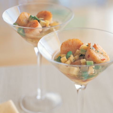 In a glass or ceramic bowl, combine the lime juice, cilantro, salt, red pepper flakes and hot sauce. Add the seared scallops and toss. Gently stir in the mango and avocado.