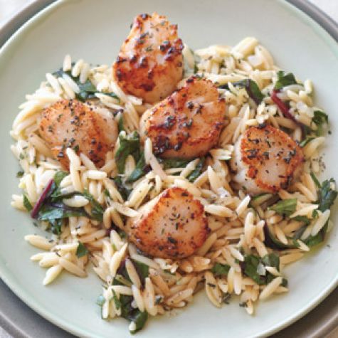 Chard stirred into the rice-shaped pasta provides a vegetable component to this risotto-like dish, transforming it into the perfect base for quickly browned sea scallops. The quick pan sauce gains bright flavors from sherry vinegar.
