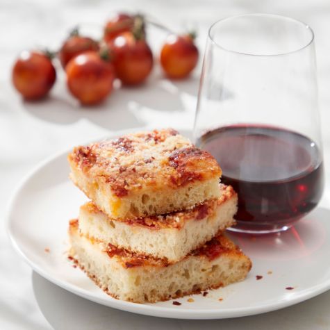 Remove the sfincione from the oven, sprinkle with the remaining 1/4 cup (1 oz./30 g) pecorino and cut into slices. Serve warm or at room temperature with the remaining tomato sauce alongside for dipping. Serves 4.