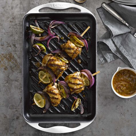 Thread an onion wedge and a lime round onto a skewer, folding the lime round in half to prevent it from sliding off the skewer. Thread a chicken thigh onto the skewer and finish with another lime round and another onion wedge. Repeat with the remaining ingredients, using 3 more skewers.