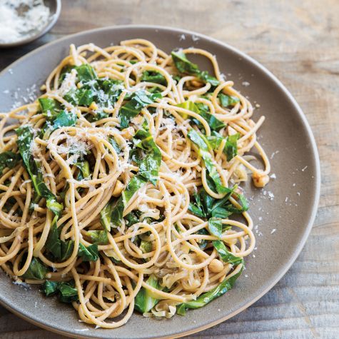 Spaghetti with Collard Greens, Hazelnuts and Caramelized Onions