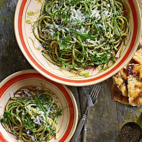 Replacing sweet basil leaves with slightly peppery arugula gives this pesto some bite. Toss with hot cooked spaghetti for a simple supper.
