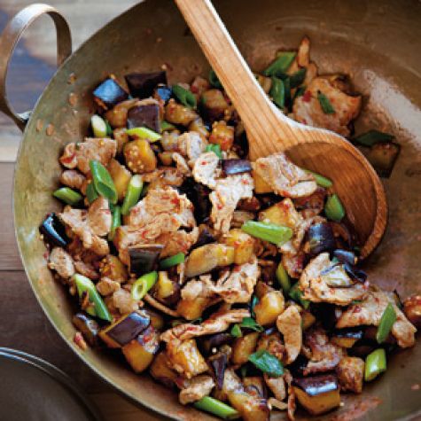 Indian summer signals the finale of deeply purple eggplants at the market. Toss cubes with tender pieces of pork in a fiery chili sauce. The eggplant flesh emerges from the wok seared on the outside but silken at heart.