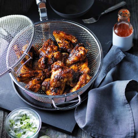 A cooling dip made with Greek yogurt tames the heat of fiery chicken wings slathered with sriracha sauce just before they come off the grill.