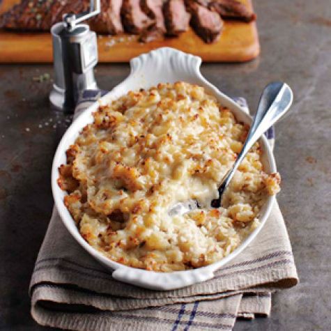 Twice-baked potatoes take on bold new dimensions of flavor in a rich, creamy gratin with shallots and cheddar cheese. This dish is one of the signature sides at Strip House, a steakhouse in New York City’s Greenwich Village. The potatoes need to be baked a day in advance, so plan accordingly.