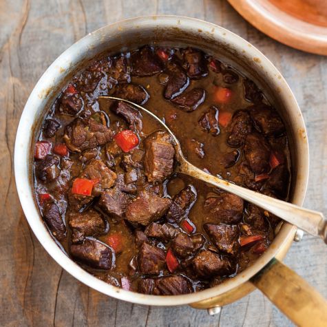 Season the beef with salt and pepper. In a large, heavy pot over medium-high heat, warm 2 Tbs. of the oil. Working in batches, sear the beef, turning occasionally, until browned, about 5 minutes. Transfer to a plate.