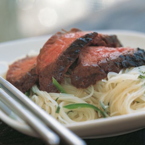 Thinly slice the steak across the grain, capturing any juices. Arrange the slices on top of the salad, drizzle with the juices and serve. Serves 4.