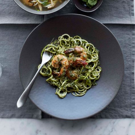 Toss the zucchini “noodles” with 3/4 cup of the pesto until evenly coated; season with salt. Divide the zucchini among 4 bowls and arrange the shrimp on top. Drizzle more pesto on the shrimp, reserving any remaining pesto for another use. Serve immediately. Serves 4.