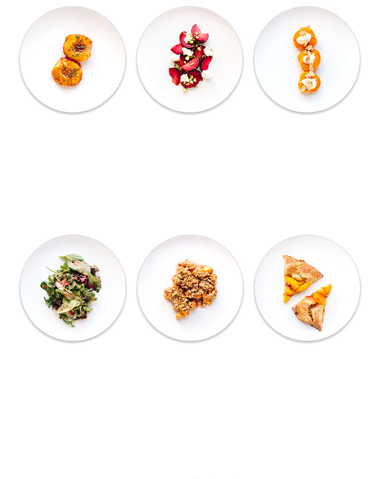 Apricots should be handled very gently, as they bruise easily. To peel the fruit: Trim away the stem, cut a shallow X in the blossom end and plunge the apricots into a large pot of boiling water until the skin peels away, 20 to 60 seconds, depending on ripeness. With a slotted spoon, transfer the fruit to ice water to cool. Drain and then peel with your fingers or a small paring knife. Wash peaches and nectarines under cold running water just before using them. To halve, use a small, sharp knife to cut down to the pit following the fruit's crease, then grasp the fruit in both hands and rotate the halves in opposite directions to separate. Scoop out the pit with the tip of the knife or a spoon. Plum skins are easy to peel if the fruit is fully ripe. If the plums are still firm and their skin clings stubbornly, cut a shallow X in the blossom end and plunge the fruit into boiling water for 1 to 2 minutes, depending on the ripeness. Rinse in cold water to cool and then carefully slip off their skins.