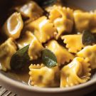 To finish, bring large pot of salted water to a boil. Drop the pasta in the boiling water. Meanwhile, in a cold 12-inch (30-cm) sauté pan add the chicken stock, butter, and sage leaves. Turn the heat to high and bring the mixture to a simmer.