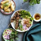 According to cookbook author and Vietnamese cooking expert Andrea Nguyen, “Like banh mi sandwiches, southern Viet rice noodle salad bowls are adaptable and great for healthful, impromptu meals. Often categorized at restaurants as rice vermicelli bowls or bun (the name of the noodles), they're built according to this blueprint: A large bowl filled with ribbons of lettuce and a thin, crunchy vegetable for texture; fresh herbs for pungency; and slippery rice noodles to convey flavors. You get to choose the toppings, which are inevitably garnished with roasted peanuts. A fancy bowl often has pickled radish and carrot for color and crunch, plus fried shallots for extra richness. You dress the bowl with nuoc cham dipping sauce, toss it with chopsticks (or a fork) and spoon and then dive in.”