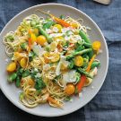 Lightly salt the boiling water. Add the carrots, boil for 2 minutes and transfer to a bowl of ice water to stop the cooking. Repeat with the asparagus, blanching for 1 minute, and the snap peas, blanching for 30 seconds.