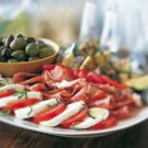 Place the olives in a small bowl and set on a large platter. Cut the grilled vegetables crosswise into bite-size pieces and arrange on the platter. Arrange the tomato and mozzarella slices on the platter, overlapping them, then sprinkle with the basil and drizzle with the 1 Tbs. olive oil. Fan out the salami and prosciutto slices, top with the bell peppers and serve. Serves 4 to 6.