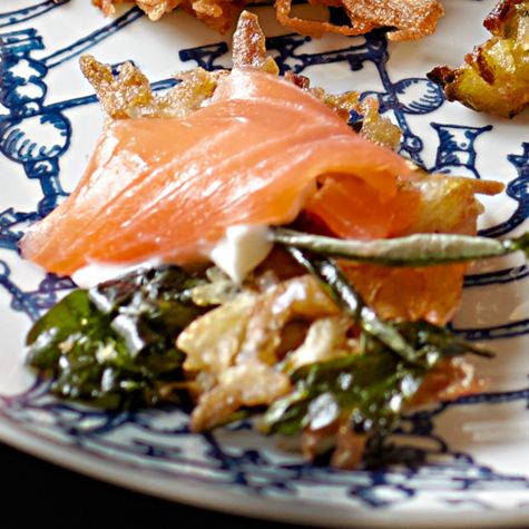 • Fresh Herb and Potato Latkes with Crème Fraîche and Smoked Salmon