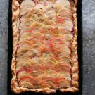 Prick the chilled puff pastry all over with a fork. Bake until it looks dried out and very lightly browned, about 8 minutes. Remove from the oven and reduce the oven temperature to 350°F. Smear a thin, even layer of the frangipane on top of the pastry and then top evenly with the sliced apples. Bake until the tart is golden and the apples are crisp-tender, about 30 minutes. Transfer to a wire rack.