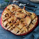 To create the lattice, lay 5 strips of dough spaced evenly apart on top of the pie filling. Fold back every other strip halfway and lay down a strip perpendicular across the unfolded strips. Repeat to place 5 strips of dough evenly across the top, folding back the alternate strips each time. Pinch the lattice strips onto the dough on the rim of the pie dish to make sure they bake together. Brush the underside of the leaf cutouts with egg wash and gently press them onto the piecrust as desired.