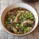 The clear broth of this soup allows the green color of the artichokes and peas to really shine. Serve this in a shallow bowl with a good loaf of bread for a light meatless meal that celebrates the arrival of spring.