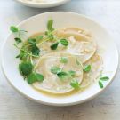 In a saucepan over medium-high heat, warm the remaining 1 Tbs. olive oil. Add the remaining onion and garlic and sauté until softened, about 5 minutes. Add the broth and the remaining lemon zest. Reduce the heat to low and simmer for 15 minutes. Season with salt and pepper. Divide the ravioli among bowls. Ladle the hot broth over the ravioli, sprinkle with the pea shoots and garnish with the Parmesan. Serve immediately. Serves 4.