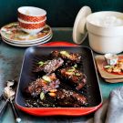 When the ribs have finished baking, generously oil a grill pan. Place the pan on the stove over high heat, watching carefully for flare-ups if using a gas stove. When the pan is hot, add the ribs to the pan, meaty side down, and sear until the ribs are nicely marked with grill marks, 1 to 2 minutes.