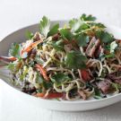 This sophisticated version of chow mein has been reinvented as a spicy noodle salad. The flavors are best when the dish is served at room temperature, making it an ideal candidate for a picnic. Complete the menu with sliced cucumbers tossed with a dressing of rice vinegar, Asian sesame oil and sugar, and accompany with ice-cold Japanese beer.