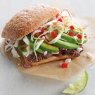 This colorful sandwich, inspired by a Mexican torta, is packed full of fresh vegetables. You can use good-quality canned refried beans or make your own. If your market doesn’t carry Mexican cheeses, crumbled fresh goat cheese is a good substitute. Black beans may seem like an unusual sandwich spread, but they add protein and flavor to this meatless meal. To reduce the fat, omit the cheese and use half the amount of avocado.