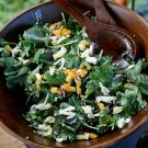 Chris Regan, the farmer at Sky Farm, in Millerton, New York, grows a beautiful mixture of baby kale for Serge Madikians, chef/owner of Serevan restaurant, located just a few miles away. The chef uses it in many forms, but one of his favorites is this simple salad that combines kale with halloumi cheese, preserved lemons and aragh vinaigrette. Aragh, a distilled alcoholic beverage in Iran that is traditionally produced from raisins, reflects the chef’s background—he’s an Armenian from Iran. Since aragh is difficult to find, Madikians suggests you substitute pastis or ouzo.