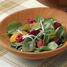 In a large salad bowl, combine the spinach, the remaining vinaigrette, the beet mixture, the oranges and the remaining mint and toss to mix. Divide the salad among 4 individual bowls, garnish with the raspberries and serve immediately. Serves 4.