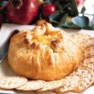 Place the dough on a lightly floured surface and set the cheese in the center of the dough. Fold the dough up over the sides of the cheese, pleating the upper edges to fit snugly around the cheese. Pinch the dough together in the center to seal. Brush the dough evenly with the egg wash and place on the prepared baking sheet.