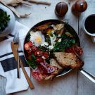 This hearty breakfast dish, the brainchild of chef Sappho Hatzis at New York City’s Bluestone Lane, has it all: eggs, vegetables, feta cheese, chimichurri sauce and prosciutto cooked to crispy perfection. When preparing the chimichurri sauce, the recipe calls for transferring the chopped herbs from the food processor to a bowl before adding the liquids; this will yield a sauce with a nice texture (you don’t want the herbs to be completely pureed). You will have some chimichurri left over; refrigerate for up to 3 days.
