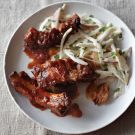 Arrange the ribs on warm individual plates and drizzle with some of the reduced sauce. Mound the slaw alongside the ribs and serve immediately. Serves 6.