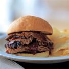 Lightly toast the rolls. Place the roll bottoms, cut side up, on individual plates and divide the brisket among them, moistening the meat on each sandwich with some of the sauce. Close the sandwiches with the tops and serve immediately. Serves 4.