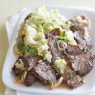 Young cabbage lightens the texture of mashed potatoes and gives them a new flavor component in this meal-in-one recipe. For easy slicing, freeze the beef for about 30 minutes before cutting. Leftover meat makes great sandwiches.