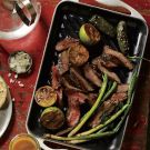 While the steak is resting, cook the green onions and limes. Grill the green onions in the grill pan over medium-high heat, turning occasionally, until browned and tender, 2 to 3 minutes. Place the lime halves, cut side down, on the grill and cook for 2 to 3 minutes.
