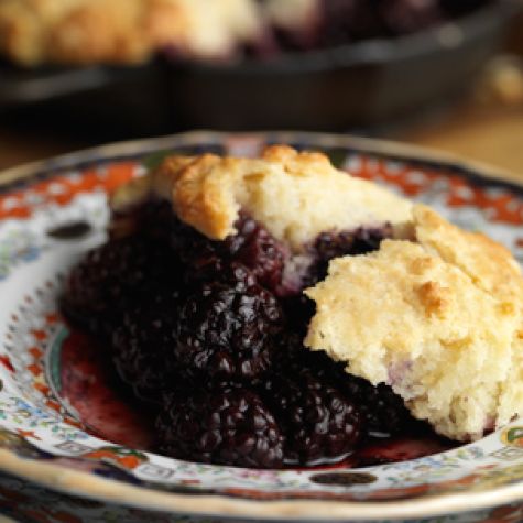 By late June, the blackberries on the farm have arrived at their peak. The berries are half the size of commercially grown berries and are purple-black and juicy, with tiny seeds and crisp skin, which makes them stand up well in desserts such as cobblers. This biscuit-dough version of cobbler allows you to use more berries, and the dough soaks up more berry juice than other pastry does. The recipe calls for a cast-iron skillet, but this cobbler can also be made in any ovenproof dish. Serve with vanilla ice cream or whipped cream.