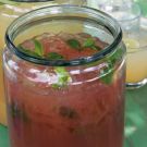 Fill the glasses about two-thirds full with the mixture, being sure to get a few mint leaves into each glass. Top the drinks with sparkling water, leaving a little room at the top, and gently stir. Using a reamer, squeeze an orange half over each drink. Garnish each drink with a mint sprig and serve. Makes 4 drinks.