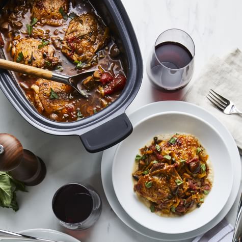 The hearty Italian stew known as chicken cacciatore, prepared in the “hunter’s style,” is a breeze to make in a slow cooker. This recipe comes to us from award-winning chef and cookbook author Bobby Flay. He combines tomatoes, mushrooms, bell peppers and fresh herbs to create a delicious sauce for meaty chicken thighs, which emerge meltingly tender and juicy after several hours of gentle simmering. Serve this cozy dish in bowls with Bobby’s Cacio e Pepe Cauliflower & White Bean Gratin for serving.