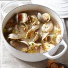 Raise the heat to medium, add the garlic, wine and water, and cook for 2 minutes. Add the clams, cover and cook until the first clam opens, about 8 minutes. Add the fish, cover and continue cooking, transferring the clams as they open to 4 bowls, until the fish is just cooked through, 5 to 7 minutes. Discard any clams that fail to open.