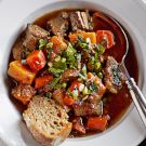 Scatter the pumpkin over the beef, cover and cook until the beef and pumpkin are very tender, 1 to 2 hours more. Discard the thyme sprigs, bay leaves and cinnamon stick. Using a large spoon, skim off the fat.