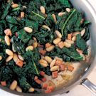 High-quality ham contributes a smoky, meaty flavor that mimics long cooking in this quick braise of peppery black kale, or cavalo nero. Creamy, earthy beans and woodsy fresh rosemary combine to create a satisfying dish that can even be served as a main course.
