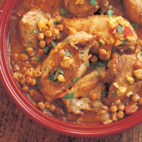 Remove the pot from the heat and let stand for 5 minutes. Skim off any fat that rises to the top of the cooking liquid. Transfer the chicken to a warmed deep platter and sprinkle with the cilantro. Serve immediately. Serves 4.