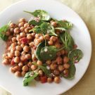 To serve, remove and discard the bay leaves from the chickpeas. Using a slotted spoon, transfer the chickpeas and vegetables to a serving bowl and moisten the chickpeas with some of the braising liquid. Top the chickpeas with the spinach salad and serve immediately. Serves 6.