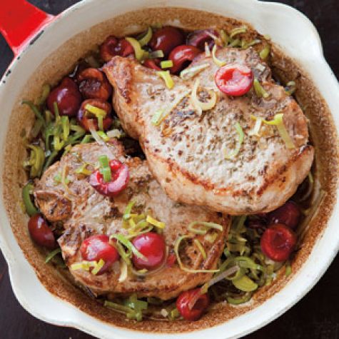 Return the pork chops and any juices to the pan and spoon the liquid over them. Cover, reduce the heat to medium-low and simmer until the pork is tender and barely pink in the center, about 15 minutes. Divide the chops among plates, spoon the cherry mixture over the top and serve immediately. Serves 4.