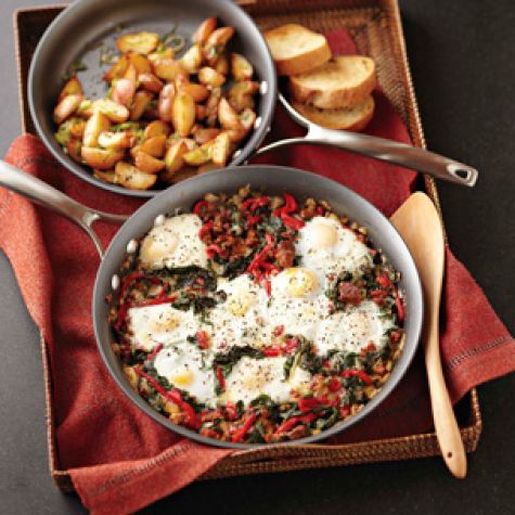 Crack the eggs over the chorizo mixture, spacing them evenly, and season with salt and pepper. Transfer the pan to the oven and bake until the eggs are just set, 5 to 6 minutes. Serve immediately with the home fries. Serves 6.