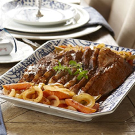 Bake until the meat is tender, about 3 1/2 hours. Remove the meat from the pan and keep it warm. Place the pan on 2 burners and boil the vegetables and sauce over medium heat until the sauce is thickened, about 30 minutes.