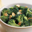 Broccoli, containing vitamins A and C and several minerals, as well as fiber, is one of the most healthful vegetables. This version is drizzled with spicy red pepper oil and garnished with crisp garlic chips.