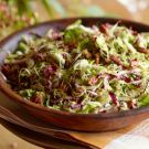 In this new take on slaw, shredded brussels sprouts and radicchio are tossed with an assertive dressing, then topped with caramelized pecans. After combining the slaw with the dressing, be sure to let it stand for 15 minutes to slightly wilt the brussels sprouts.