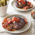 Sprinkle the burgers with salt and pepper. Grill to your desired doneness, about 3 minutes per side for rare. Transfer to warmed plates, top with the tomato mixture and serve immediately. Serves 4.