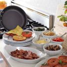 This recipe features all the components you’ll need to have diners create their own omelettes. Prep the ingredients before everyone arrives (you can do much of the work the night before). Then arrange the food in individual serving dishes on a buffet table next to the stove. Guests can custom-make omelettes as they please. Sourdough toast is the perfect accompaniment.