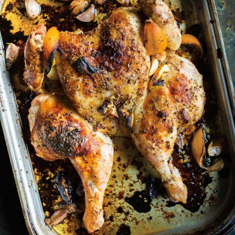To serve, using clean poultry shears or a chef’s knife, cut the chicken into 10 serving pieces (2 legs, 2 thighs, 2 wings and 4 breast pieces). Transfer to a warmed serving platter and spoon the pan juices, including the garlic and lemon pieces, over the chicken. Serve immediately. Serves 4.