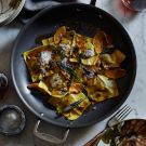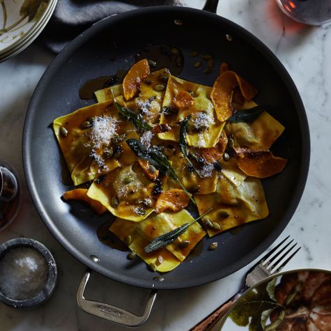 Drizzle the brown butter over the ravioli, then sprinkle evenly with the sage leaves and butternut squash slices. Garnish with pepitas and serve immediately, passing more cheese alongside. Serves 6.